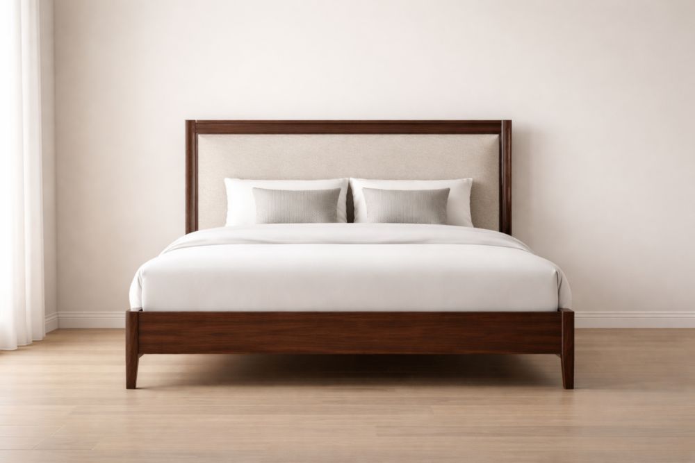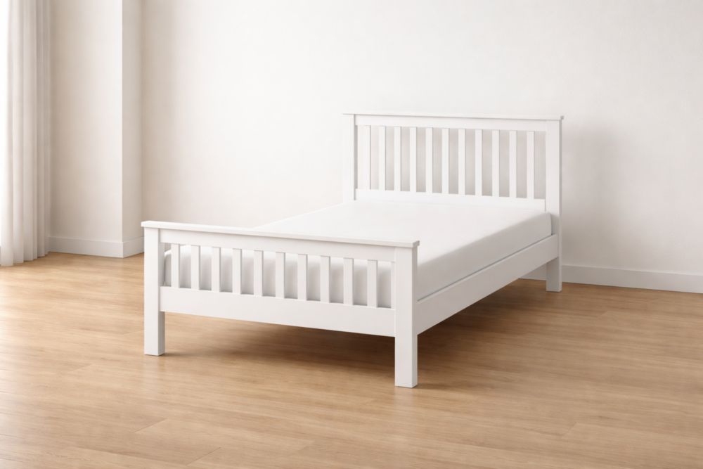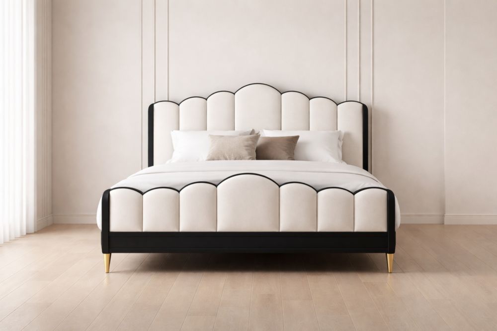 Letto matrimoniale in legno con rivestimento in tessuto bianco
