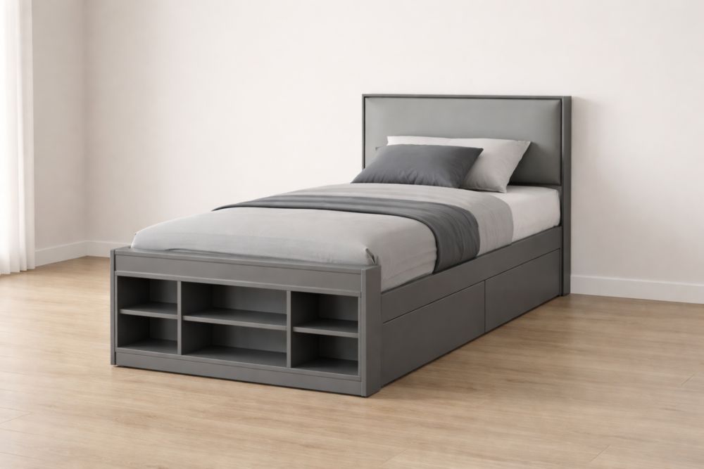 Letto matrimoniale in legno e metallo noce con testiera libreria
