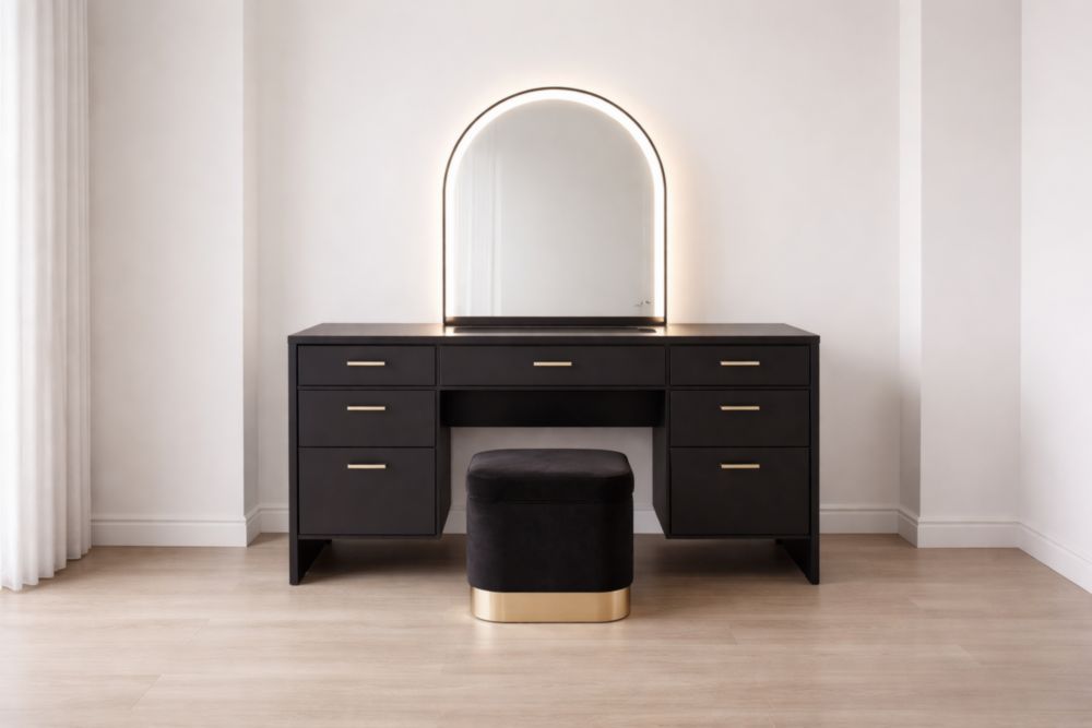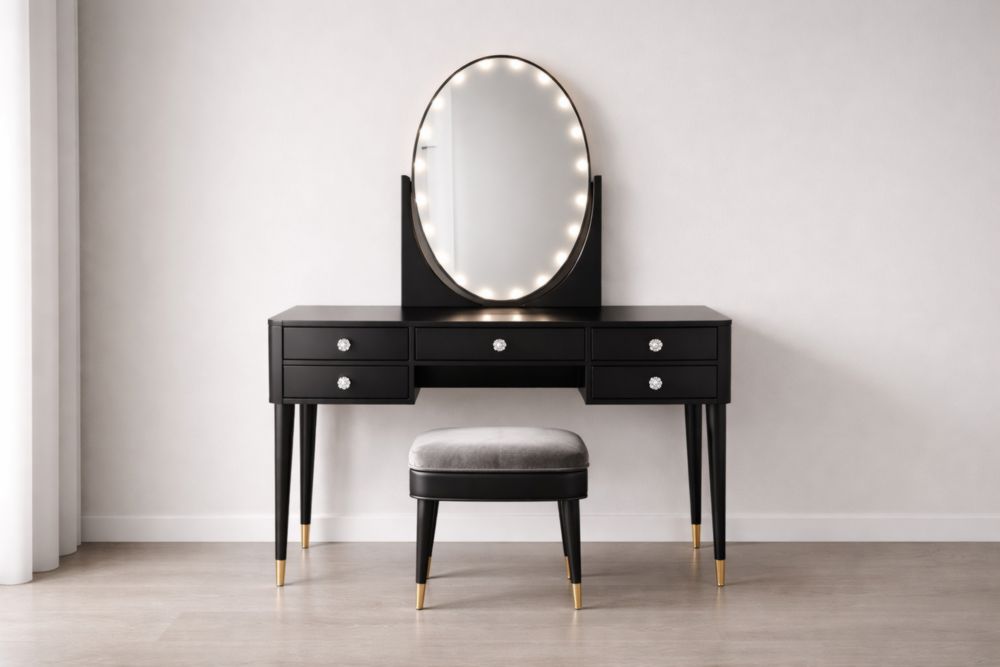 Tavolo da toeletta in legno nero con specchio ovale illuminato e sgabello