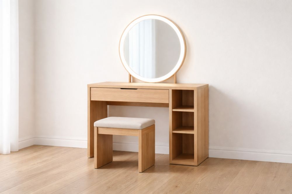 Tavolo da toeletta in legno beige con specchio ovale e sgabello imbottito