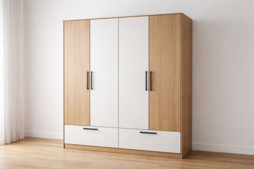 Armadio in Legno e MDF a Quattro Ante con Cassetti