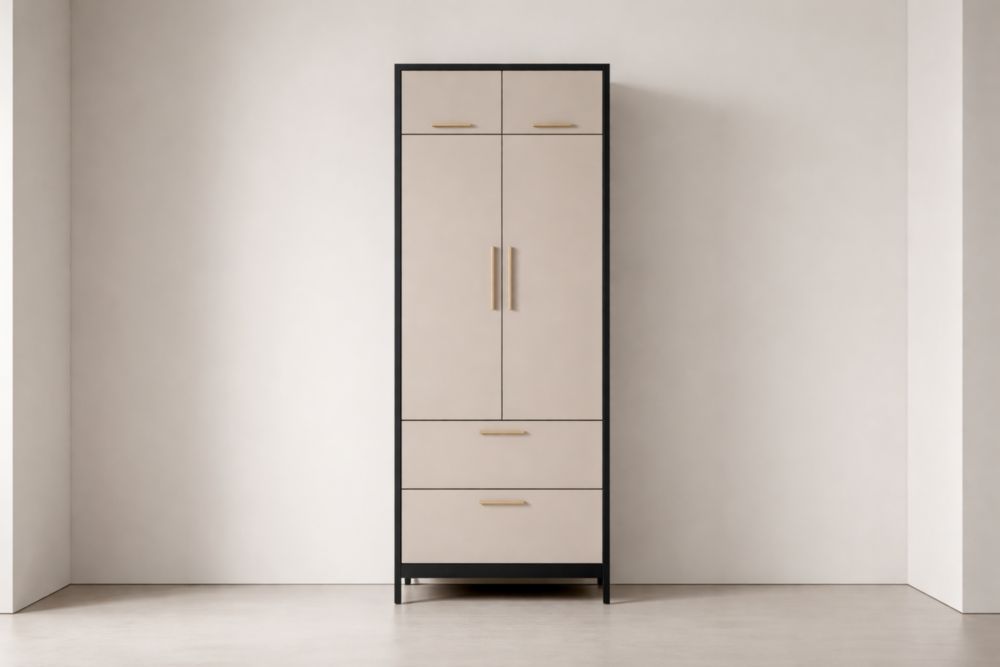 Armadio in MDF e Metallo con Due Ante e Cassetti Beige e Nero