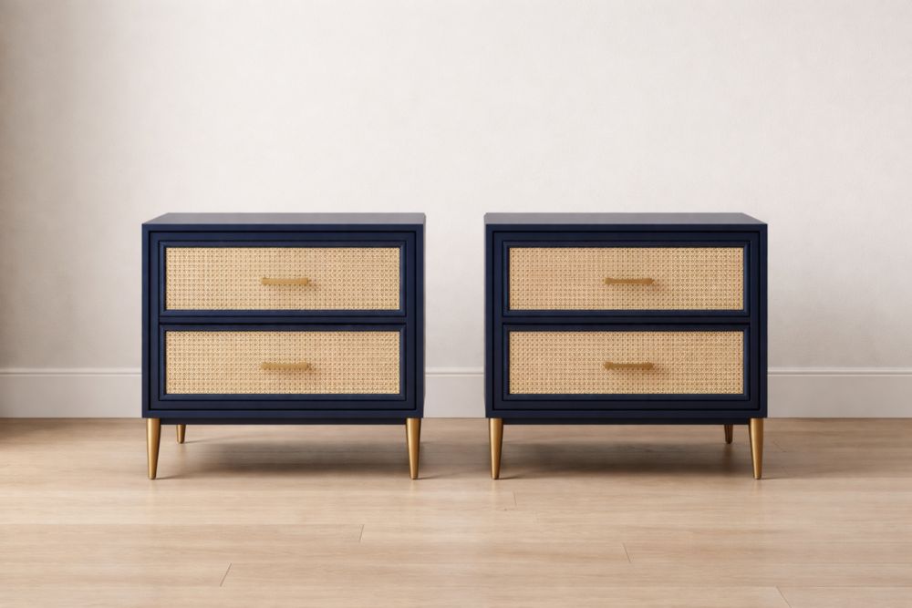 Comodini in Legno e Rattan Blu 60x40x50 cm