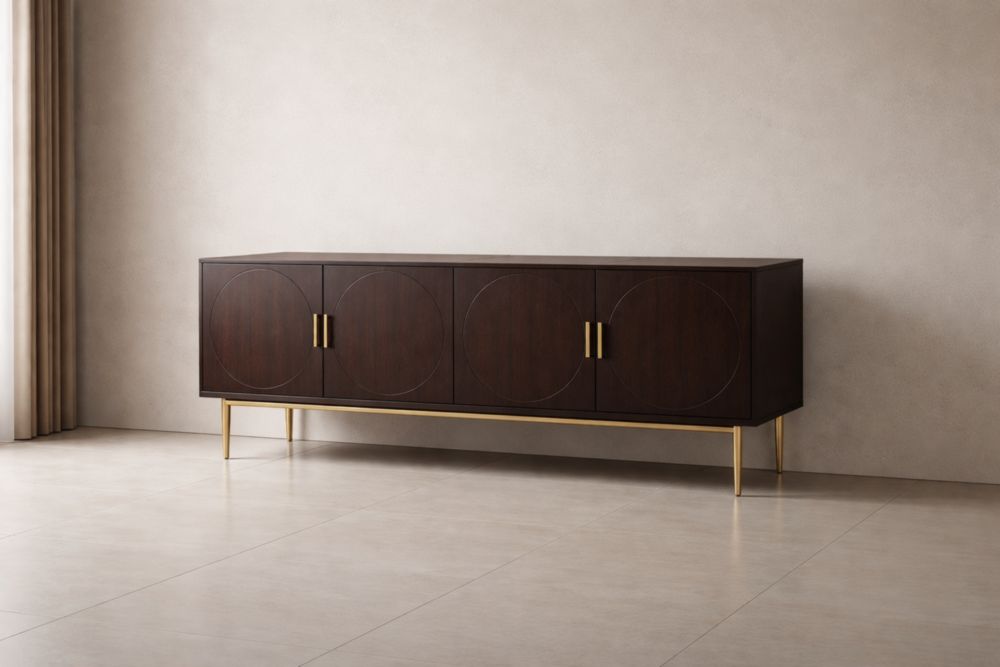 Materiale principale: legno massello di noce  con verniciatura trasparente. Gambe in acciaio verniciato a polvere dorato.