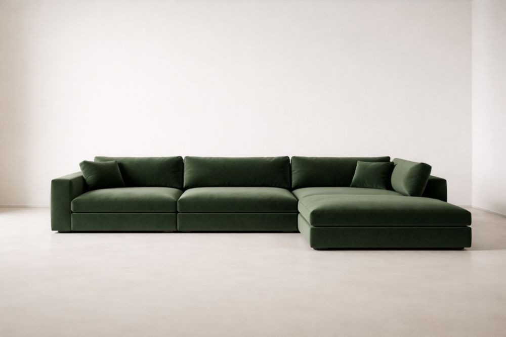Questo divano ad angolo è realizzato con rivestimento in tessuto di poliestere, struttura interna in legno di pino massello e imbottitura in schiuma poliuretanica. Dimensioni totali: 315 cm lunghezza x 160 cm larghezza x 85 cm altezza. Non richiede assemblaggio.