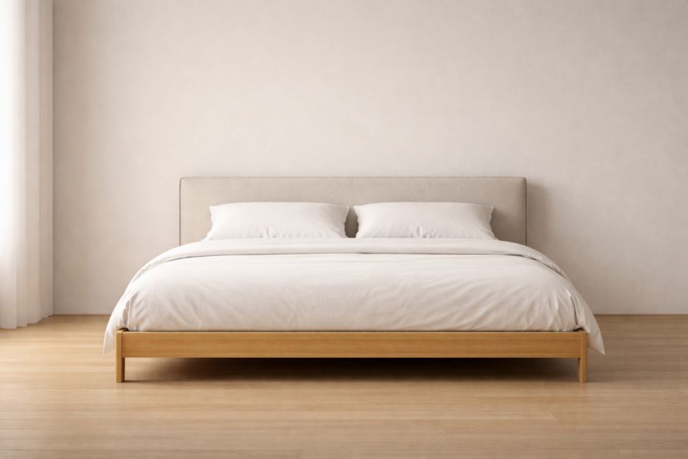 Letto matrimoniale in legno con rivestimento in tessuto bianco