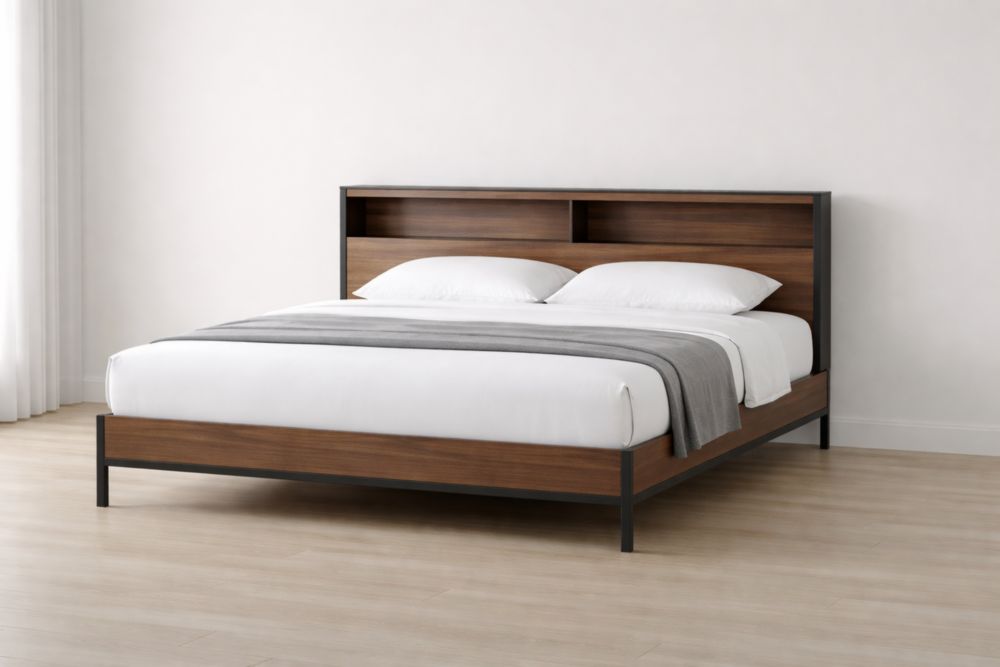 Letto matrimoniale in legno e metallo noce con testiera libreria