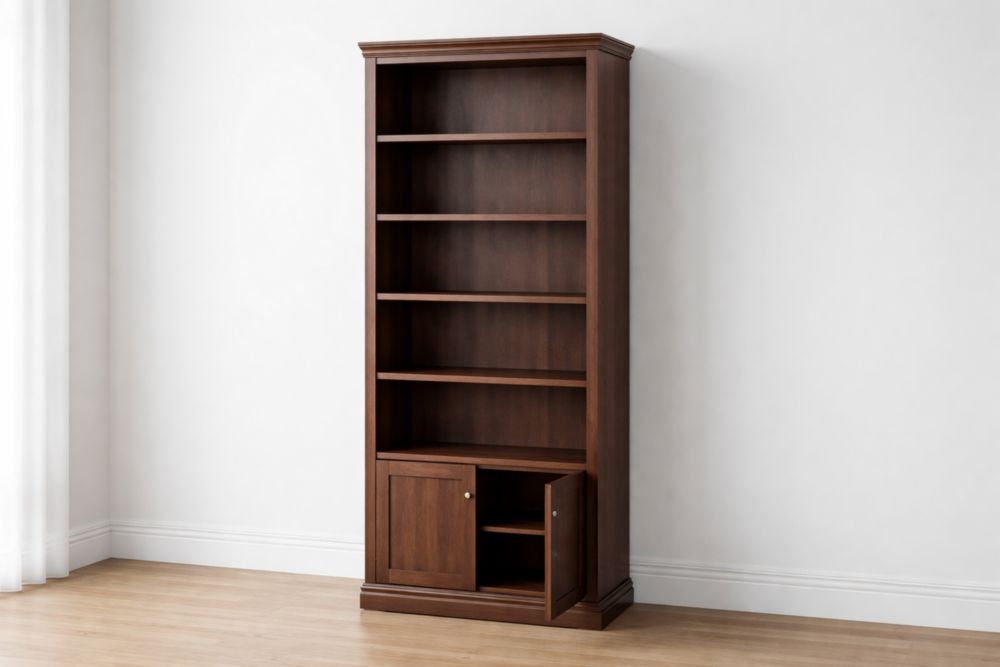 La libreria è realizzata in pannelli in MDF rivestiti in laminato. È composta da cinque ripiani e un armadietto con ante a battente. Dimensioni: altezza 195 cm, larghezza 80 cm, profondità 30 cm. Colore: marrone.