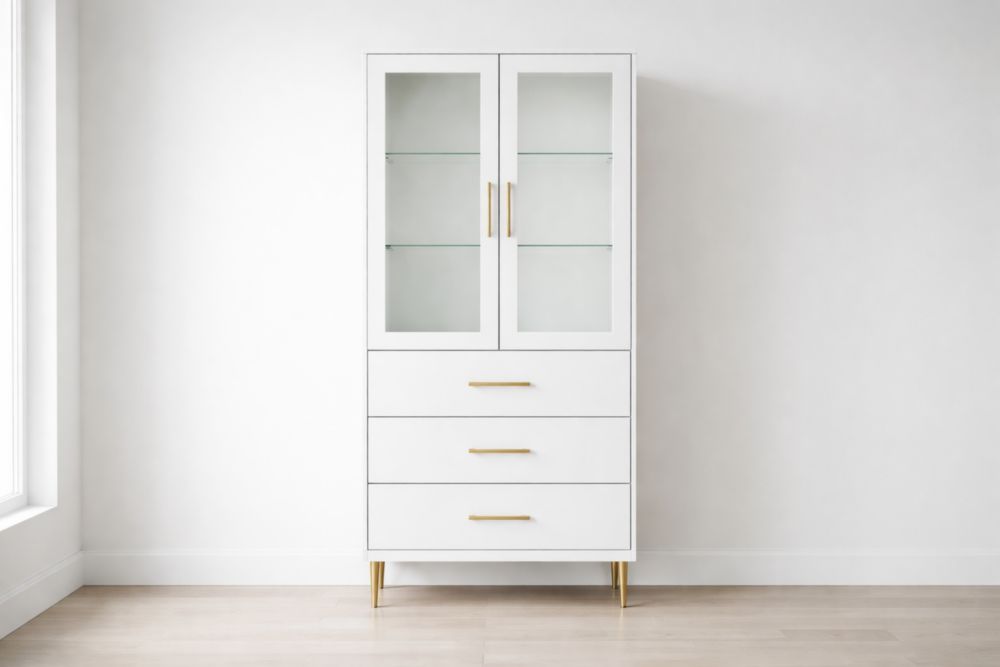 Mobile Vetrina in MDF e Vetro Temperato Bianco con Cassetti
