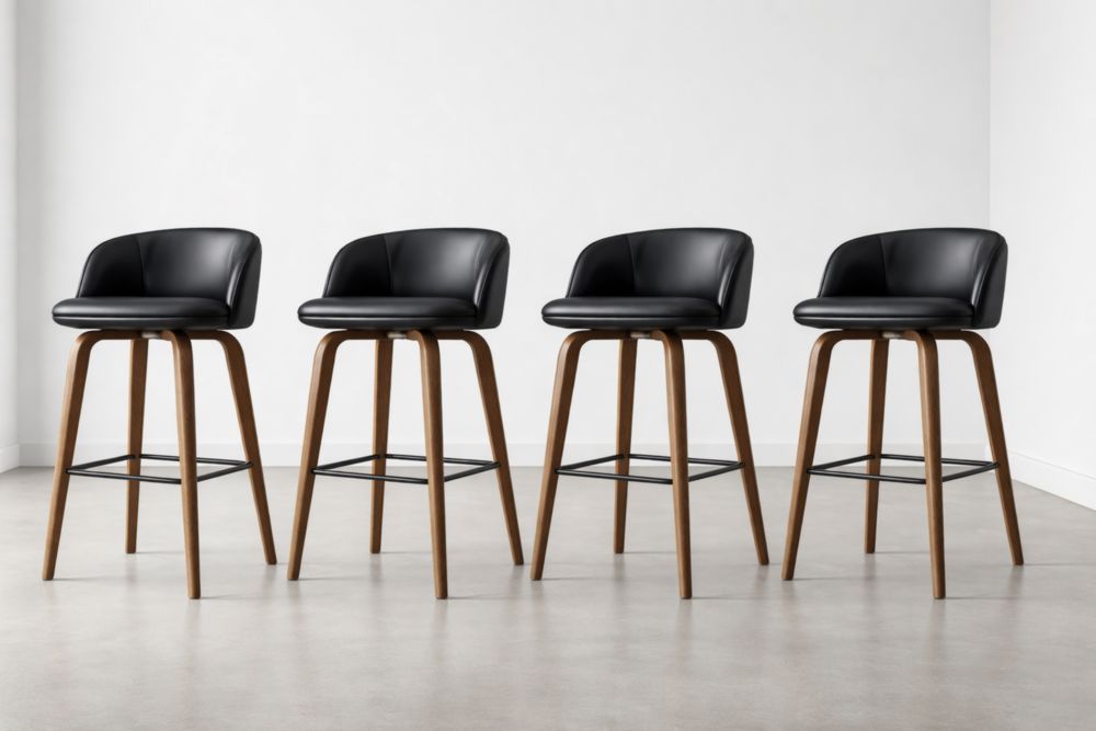 Set di 4 Sgabelli Alti in Pelle Nera e Legno